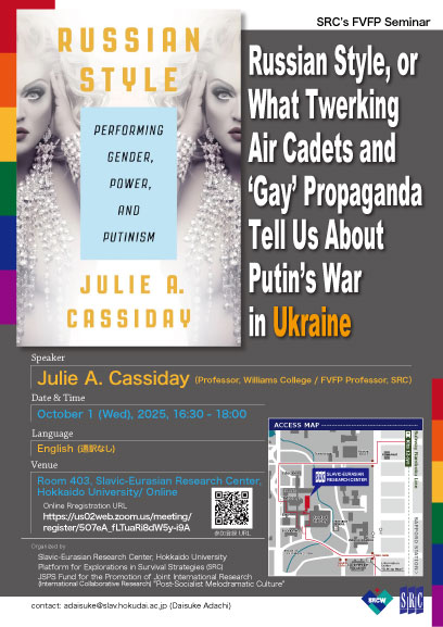 Bio : Julie Cassiday is the Willcox B. and Harriet M. Adsit Professor of Russian at Williams College (Massachusetts, USA), where she teaches Russian language, literature, and culture, as well as Comparative Literature and Women's, Gender, and Sexuality Studies. She is currently a Foreign Visitor Fellow in Slavic-Eurasian Research Center at Hokkaido University. Her research focuses on performance in Russian culture, and she has written a book on the emergence of the show trial in early Soviet Russia, as well as articles on topics ranging from Stalinist film to the cult of personality around Vladimir Putin. Her most recent book, published in 2023, is titled Russian Style: Performing Gender, Power, and Putinism, and her current research focuses on Russophone Boys Love, a transnational genre of popular romance.
