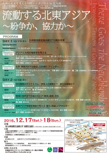 NoA-SRC of the NIHU Area Studies Project for Northeast Asia co-hosted this symposium with several different universities and research organizations including the Center for Northeast Asian Studies (Tohoku University), Center for Asia-Pacific Future Studies (Kyushu University), University of Kitakyushu, Kyushu Economic Research Center, Asian Growth Research Institute, Japan International Border Studies Network (JIBSN), academic institutions and organizations of Kitakyushu City, and the West Japan Industry and Trade Convention Association.