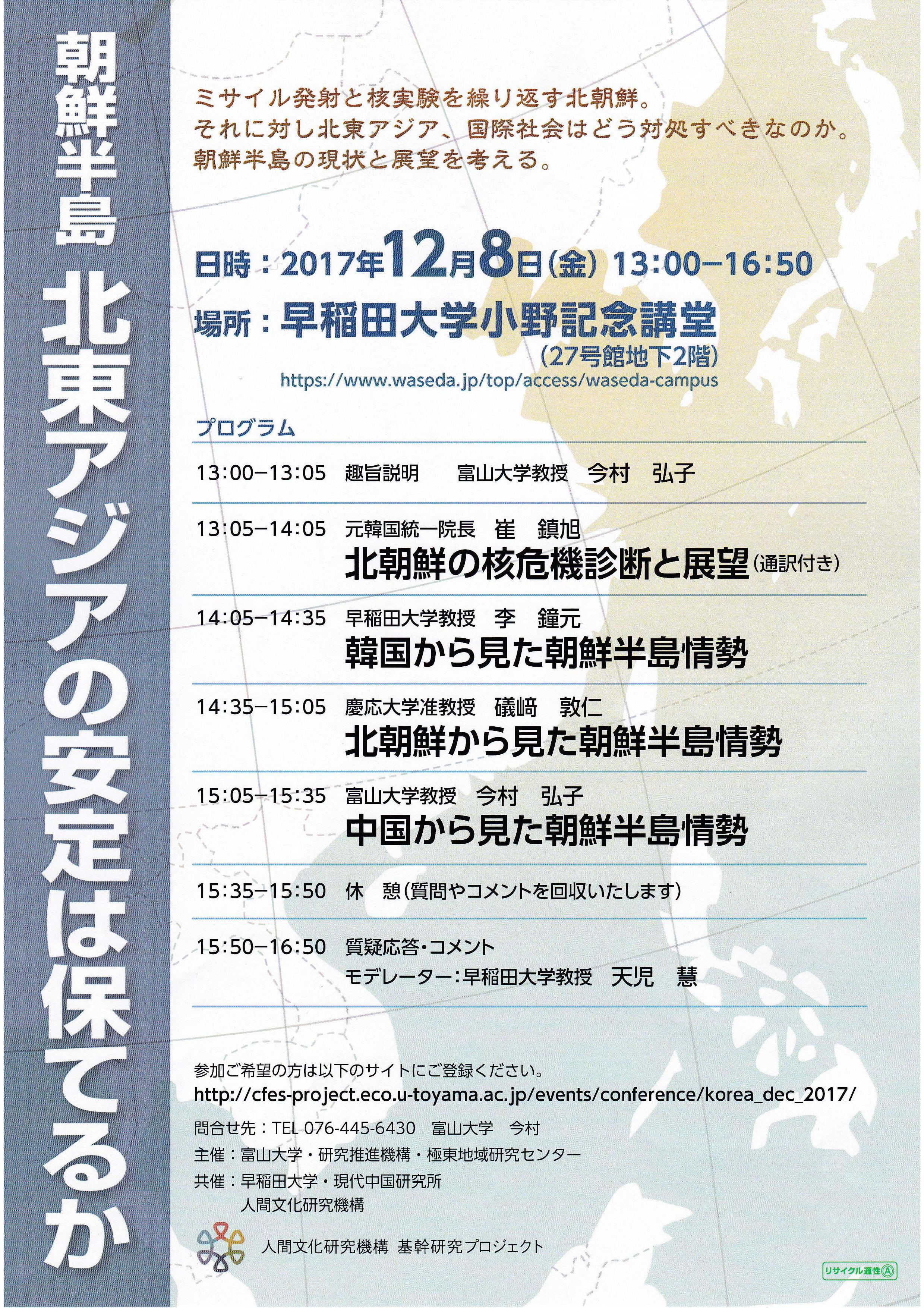 2017年12月8日(金)に、NIHU北東アジア地域研究プロジェクト早稲田大学拠点と富山大学拠点の共催で、シンポジウム「朝鮮半島:北東アジアの安定は保てるか」が開催されます。メインゲストとして崔鎮旭先生(韓国・統一研究院 元院長)をお迎えする予定です。会場は早稲田大学早稲田キャンパス 小野記念講堂(27号館)です。