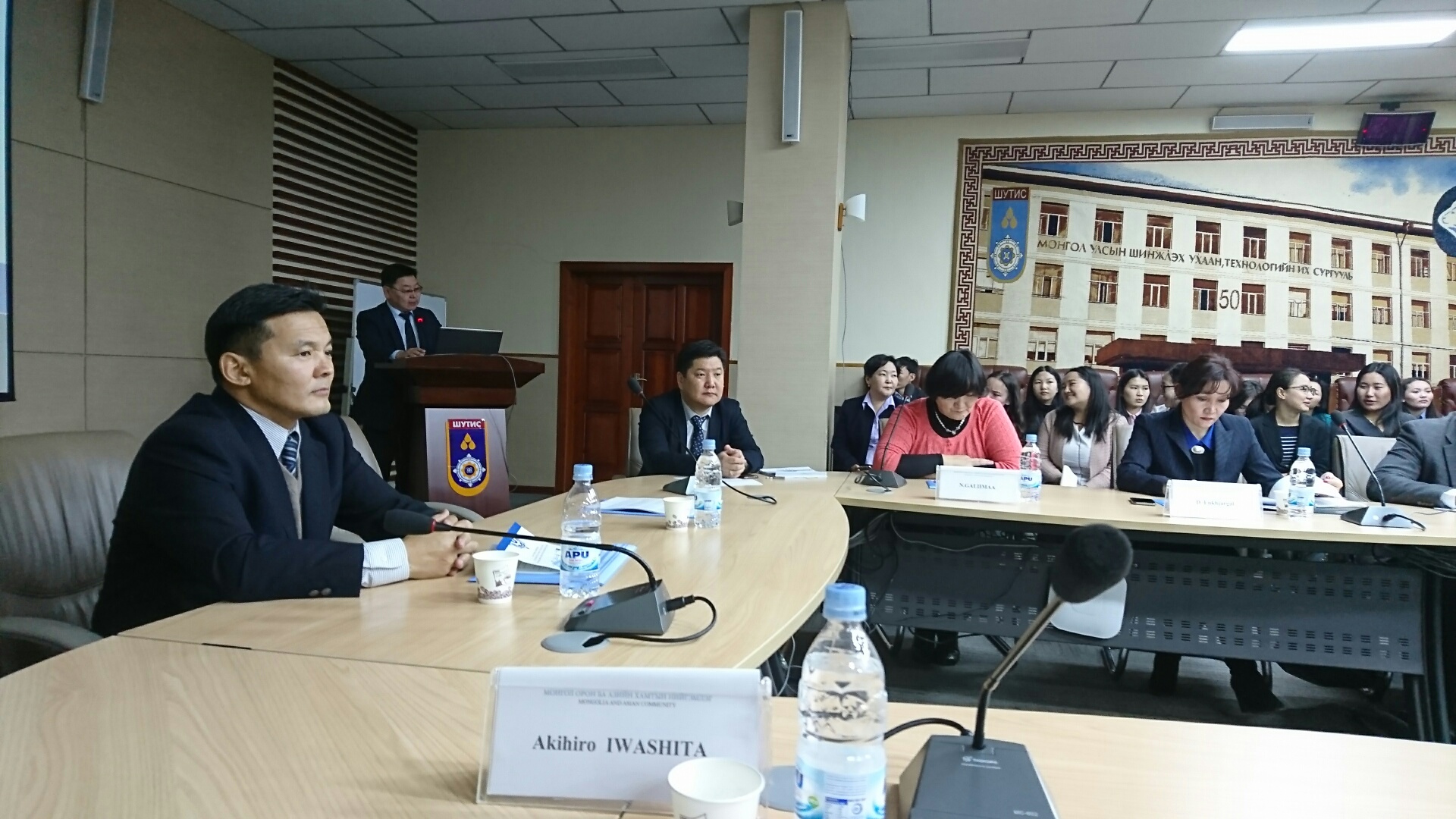本拠点では、アジアの共同体づくりに関する事業に積極的に関わっています。2017年9月から2018年3月まで9回にわたり、ウランバートルのモンゴル国立科学技術大学で「アジア共同体」に関する連続講義が開催されています。同大学の人文学院がワンアジア財団の助成を受けて企画実施しています。韓国、ロシア、日本からも講師陣が参加し、本拠点からは岩下が11月17日の第6回講義で講演しました。