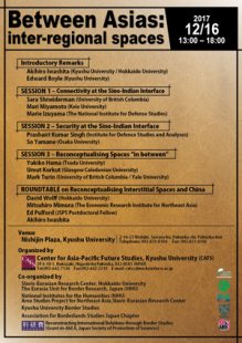【共催シンポジウム】共催国際シンポジウム開催のお知らせ/12月16日@九州大学西新プラザ 2017.11.22 EVENT, 関連イベント International Symposium “Between Asias: inter-regional spaces” 2017/12/16 Sat. 13:00 – 18:00 Venue: Nishijin Plaza, Kyusyu University Language: English
