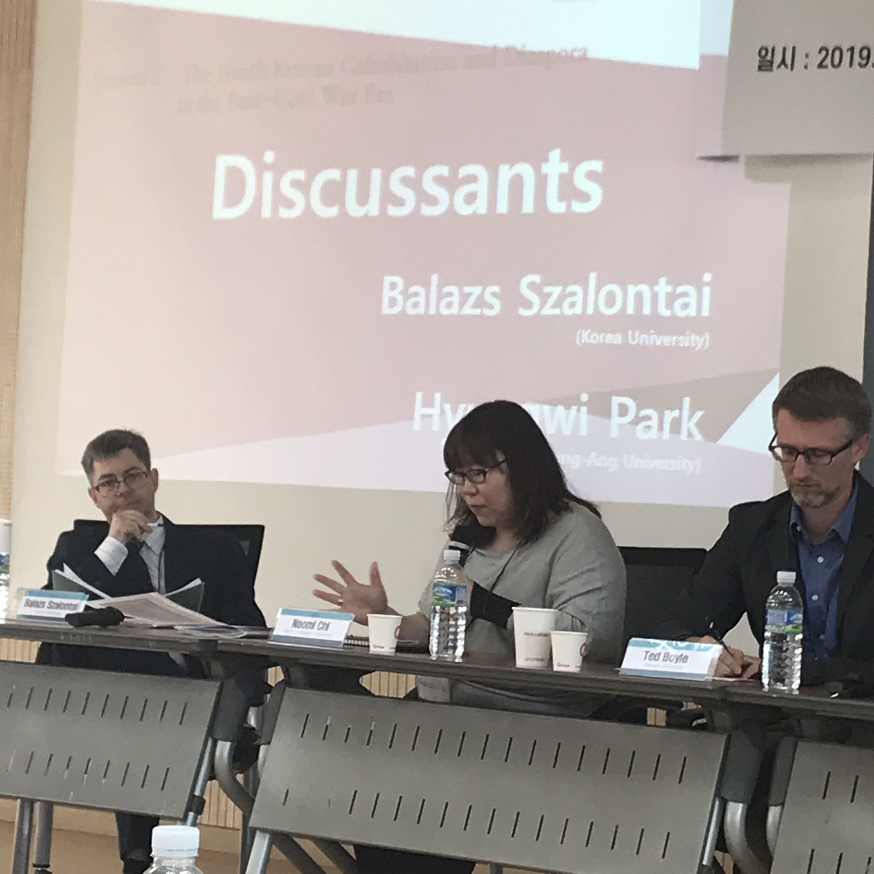 第二セッション「The North Korean Cohabitation and Diaspora in the Post-Cold War Era」(ポスト冷戦時代の北朝鮮との共存とディアスポラ)では、池が中国、韓国を行き先とする脱北者の女性達が直面する人権侵害、暴力、搾取などの問題を取り上げました。また、ボイルは中朝国境に焦点を当て、国境の機能を制度、プロセス、空間という三つの観点から考察しました。