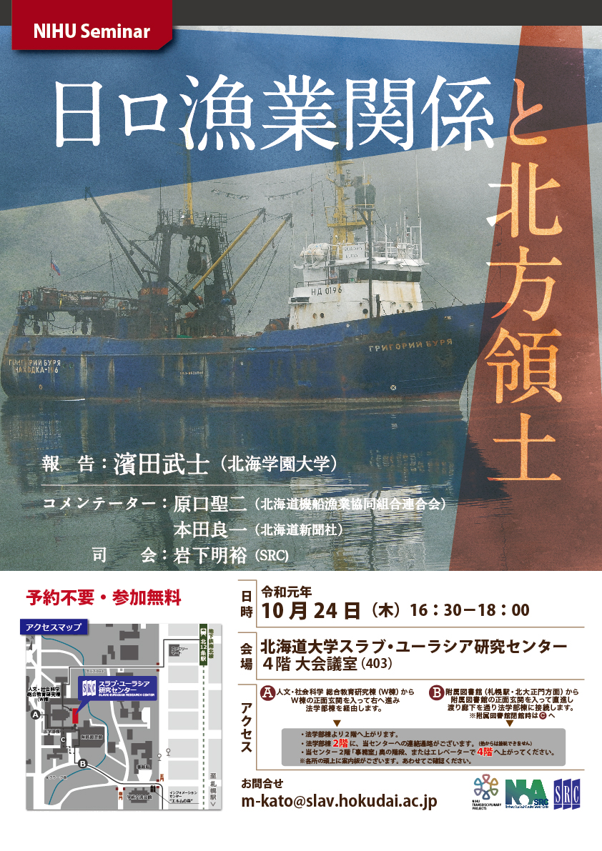 2019年10月24日(木)16:30~18:10に、北海学園大学の濱田武士教授をお招きしてNIHUセミナー「日ロ漁業関係と北方領土」を開催致します。コメンテーターには北海道機船漁業協同組合連合会の原口聖二常務と北海道新聞の本田良一記者をお迎えします。会場は、北海道大学スラブ・ユーラシア研究センター4階大会議室(403)です。参加無料、ご予約不要ですので、ご関心のある方は奮ってご参加下さい。