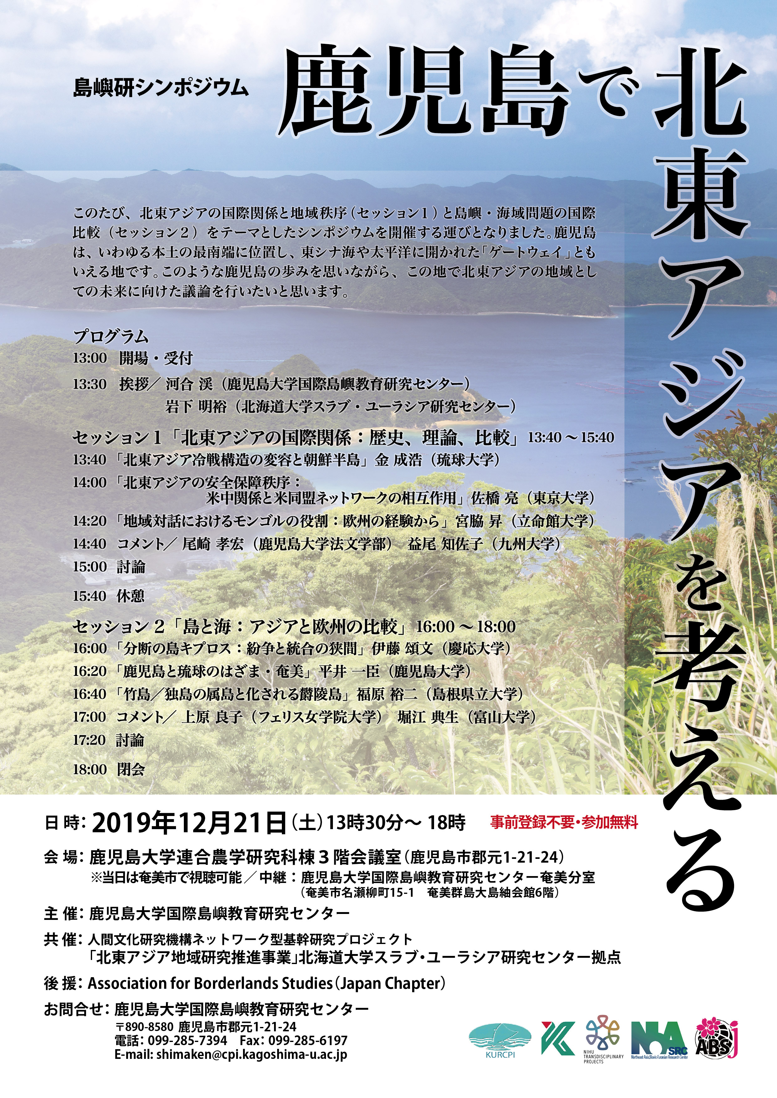 【共催】シンポジウム「鹿児島で北東アジアを考える」(2019年12月21日、鹿児島大学) 2019.11.22 EVENT, 主催イベント, セミナー, NEWS 2019年12月21日(土)に鹿児島大学連合農学研究科棟において、シンポジウム「鹿児島で北東アジアを考える」が開催されます。このシンポジウムは、鹿児島大学国際島嶼教育研究センター主催の下、NIHU北東アジア地域研究事業北海道大学拠点(NoA-SRC)の共催で企画・実施されます。 詳細はポスター画像をクリックしてご覧ください。 参加無料、事前登録不要です。 本ウェブサイトからのお問合せ先: 加藤 m-kato[at]slav.hokudai.ac.jp