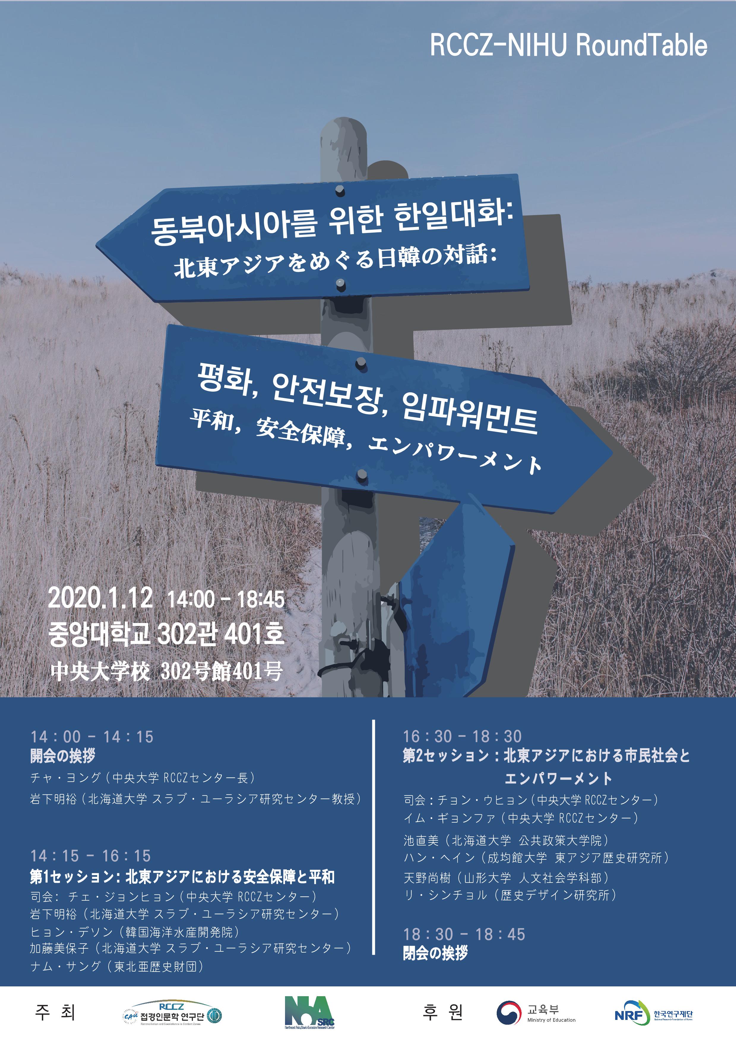 NIHU北東アジア地域研究事業・北大拠点は、2020年最初のイベントとして、1月12日(土)に中央大学校「境域における和解と共生研究」(RCCZ)センター(ソウル市)において、ラウンドテーブル形式のセミナーを企画しています。テーマは「北東アジアをめぐる日韓の対話:平和、安全保障、エンパワーメント」です。