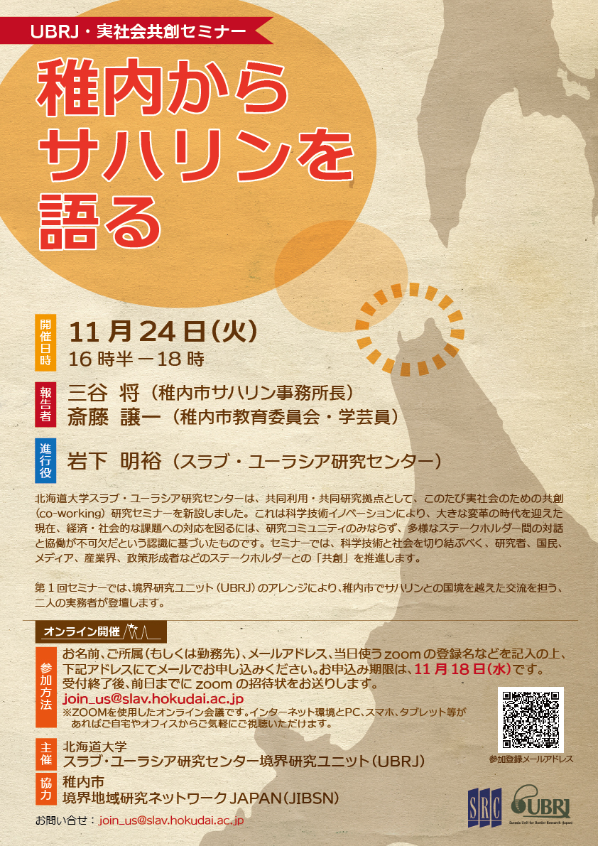 【関連セミナー】UBRJ・実社会共創セミナー「稚内からサハリンを語る」(2020.11.24) 2020.10.30 EVENT, 主催イベント, セミナー, 関連イベント, NEWS 2020年11月24日(火)に、北海道大学スラブ・ユーラシア研究センターにUBRJ・実社会共創セミナーが開催されます。ご報告テーマは「稚内からサハリンを語る」です。 ご関心のある方の参加を歓迎いたします。奮ってご参加ください。 お問合せ先:join_us[at]slav.hokudai.ac.jp 詳細は、下記のポスターをクリックしてご覧ください。