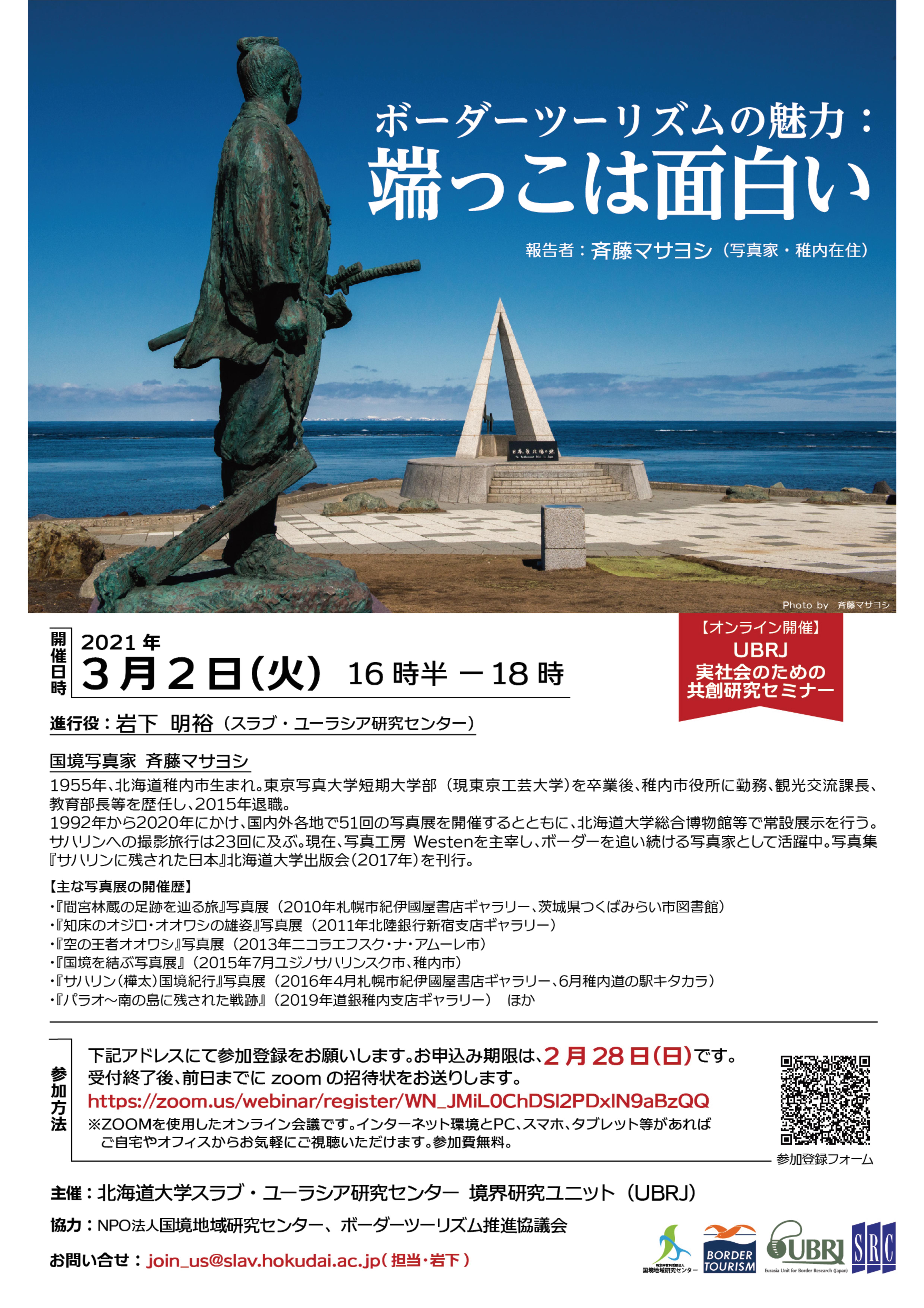 2021年3月2日(火)に、北海道大学スラブ・ユーラシア研究センターにUBRJ・実社会のための共創研究セミナーが開催されます。ご報告テーマは「ボーダーツーリズムの魅力:端っこは面白い」です。