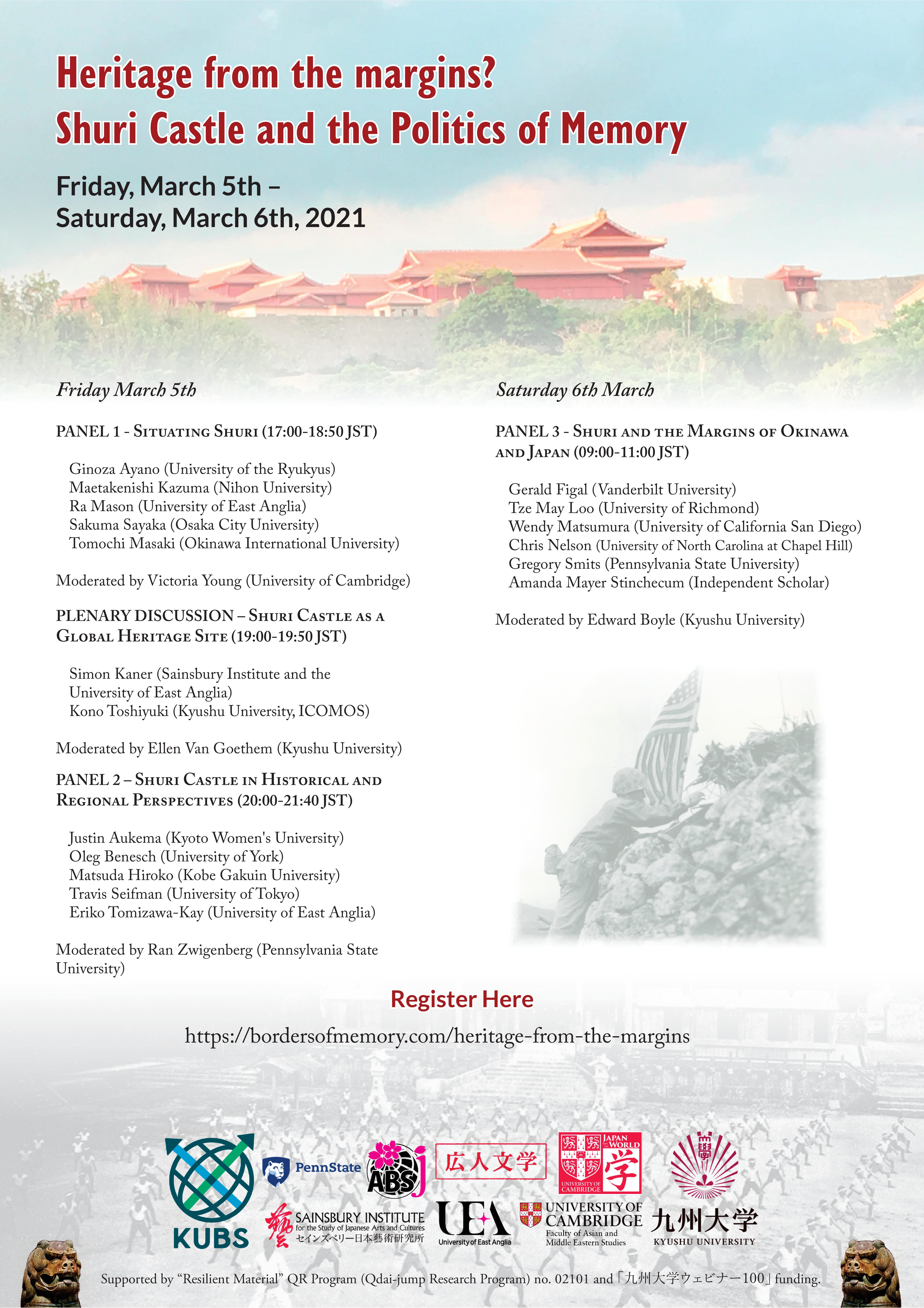 【関連イベント】Conference “Heritage from the margins? Shuri Castle and the Politics of Memory” (2021/03/05~2021/03/06)) 2021.02.19 EVENT, セミナー, 関連イベント, NEWS 2021年3月5日 (金) ~2021年3月 5日 (土)に、九州大学に”Heritage from the margins? Shuri Castle and the Politics of Memory”コンファレンスが開催されます。 ご関心のある方の参加を歓迎いたします。 お問合せ先:https://bordersofmemory.com/heritage-from-the-margins 詳細は、下記のポスターをクリックしてご覧ください。