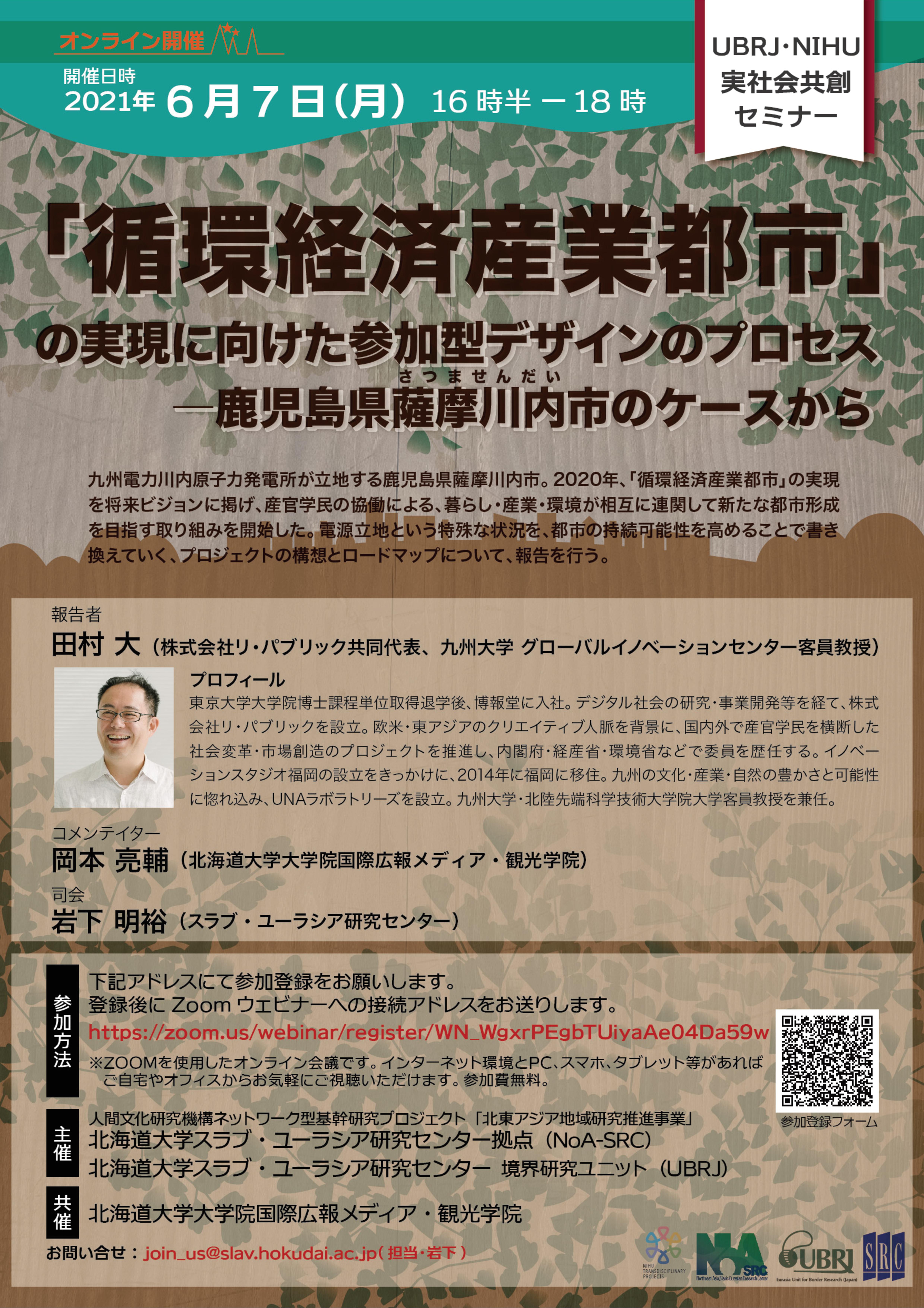 2021年6月7日(月)に、北海道大学スラブ・ユーラシア研究センターにUBRJ・NIHU実社会共創セミナーが開催されます。ご報告テーマは”「循環経済産業都市」の実現に向けた参加型デザインのプロセス―鹿児島県薩摩川内市のケースから”です。