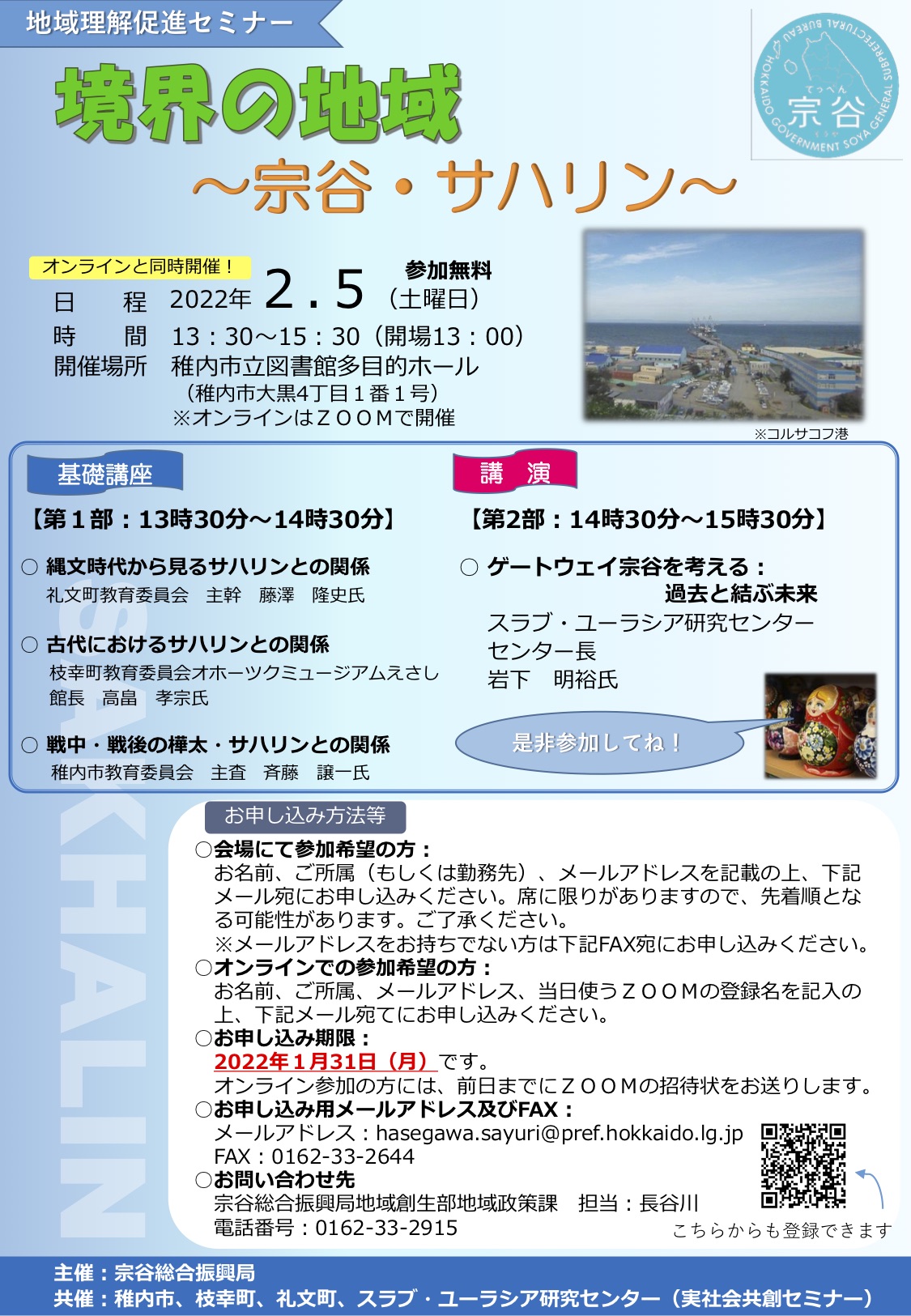【関連セミナー】地域理解促進セミナー「境界の地域〜宗谷・サハリン」(2022.02.05) 2021.12.22 EVENT, セミナー, 関連イベント, NEWS 2022年2月5日(土)、稚内市立図書館多目的ホール(稚内市大黒4丁目1番1号)に地域理解促進セミナーが開催されます(オンラインと同時開催)。ご報告テーマは「境界の地域〜宗谷・サハリン」です。 日時:13:30~15:30(開場13:00) ご関心のある方の参加を歓迎いたします。奮ってご参加ください。 お問合せ先:長谷川 hasegawa.sayuri[at]pref.hokkaido.lg.jp 詳細は、下記のポスターをクリックしてご覧ください。