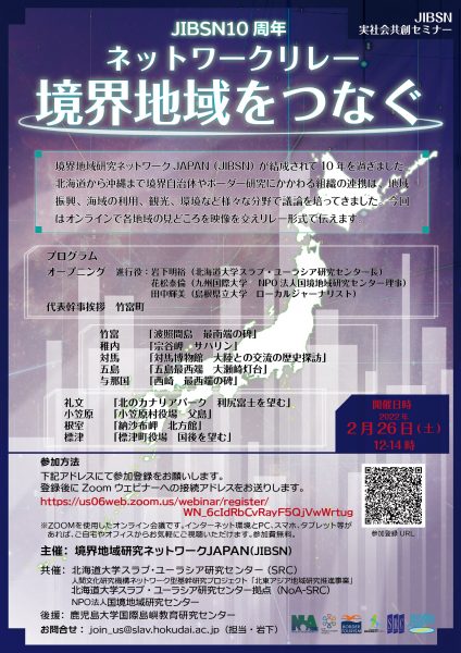 境界地域研究ネットワークJAPAN(JIBSN)が結成されて10年を過ぎました。北海道から沖縄まで境界自治体やボーダー研究にかかわる組織の連携は、地域振興、海域の利用、観光、環境など様々な分野で議論を培ってきました。今回はオンラインで各地域の見どころをリレー形式で伝えてもらいました。