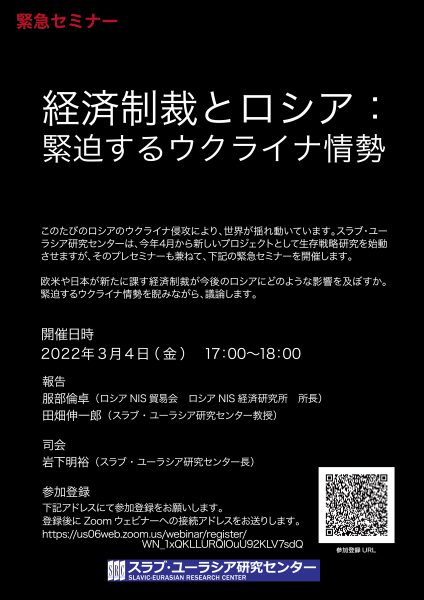 2022年3月4日(金)に、SRC緊急セミナー「経済制裁とロシア:緊迫するウクライナ情勢」が開催されました。セミナーの様子を動画でご覧になることができます。(YouTube動画再生)