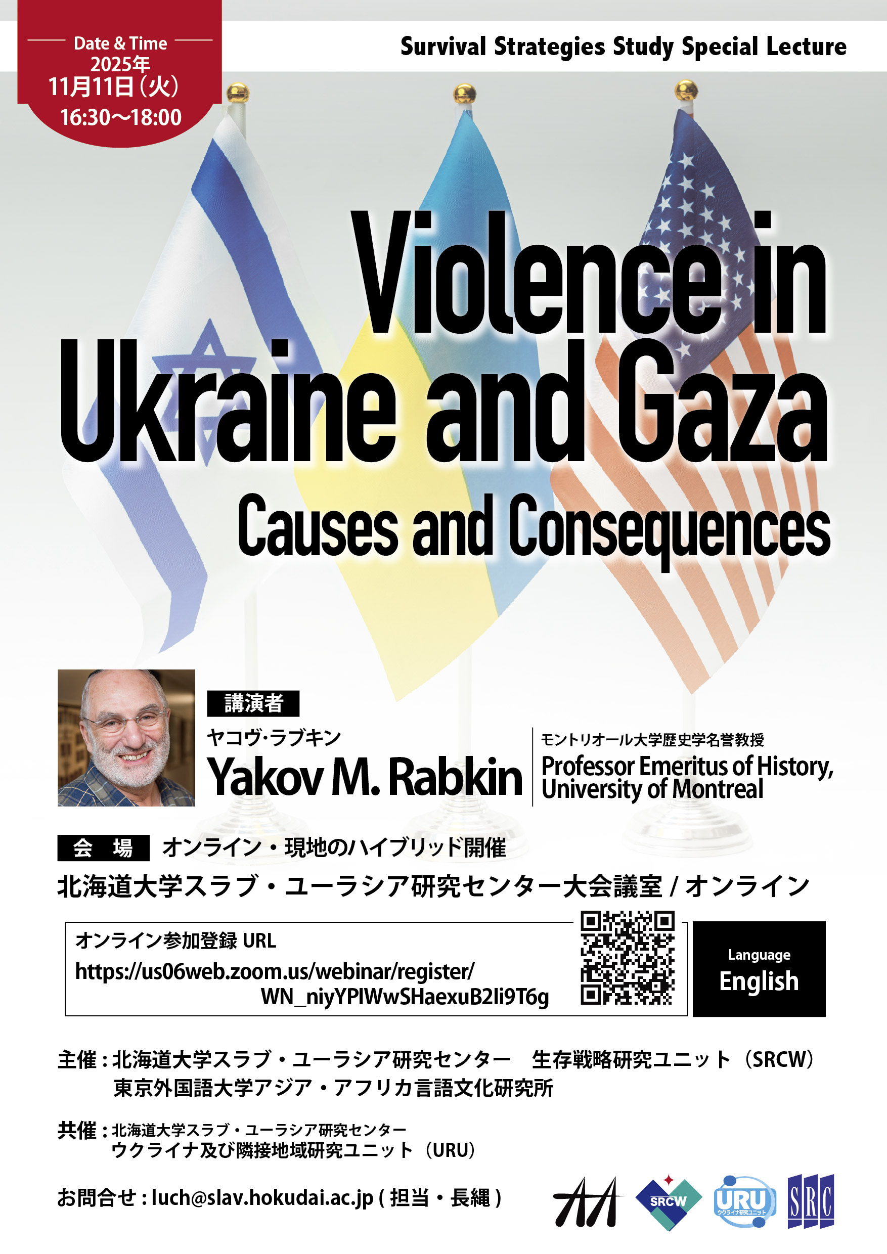 ![]() | Date and Time: Tuesday, November 11, 2025, 16:30-18:00 Speaker: Yakov M. Rabkin (Professor Emeritus of History, University of Montreal) Title: “Violence in Ukraine and Gaza: Causes and Consequences” Venue: Room 403, Slavic-Eurasian Research Center, Hokkaido University Registration for Online Participation : https://us06web.zoom.us/webinar/register/WN_niyYPIWwSHaexuB2Ii9T6g Language : English Organized by : Platform for Explorations in Survival Strategies at the Slavic-Eurasian Research Center, Hokkaido University Research Institute for Languages and Cultures of Asia and Africa, Tokyo University of Foreign Studies Co-Organized by : Research Unit for Ukraine and Neighboring Areas, Slavic-Eurasian Research Center, Hokkaido University Contact : Norihiro Naganawa < luch[at]slav.hokudai.ac.jp > ([at] read as @) |