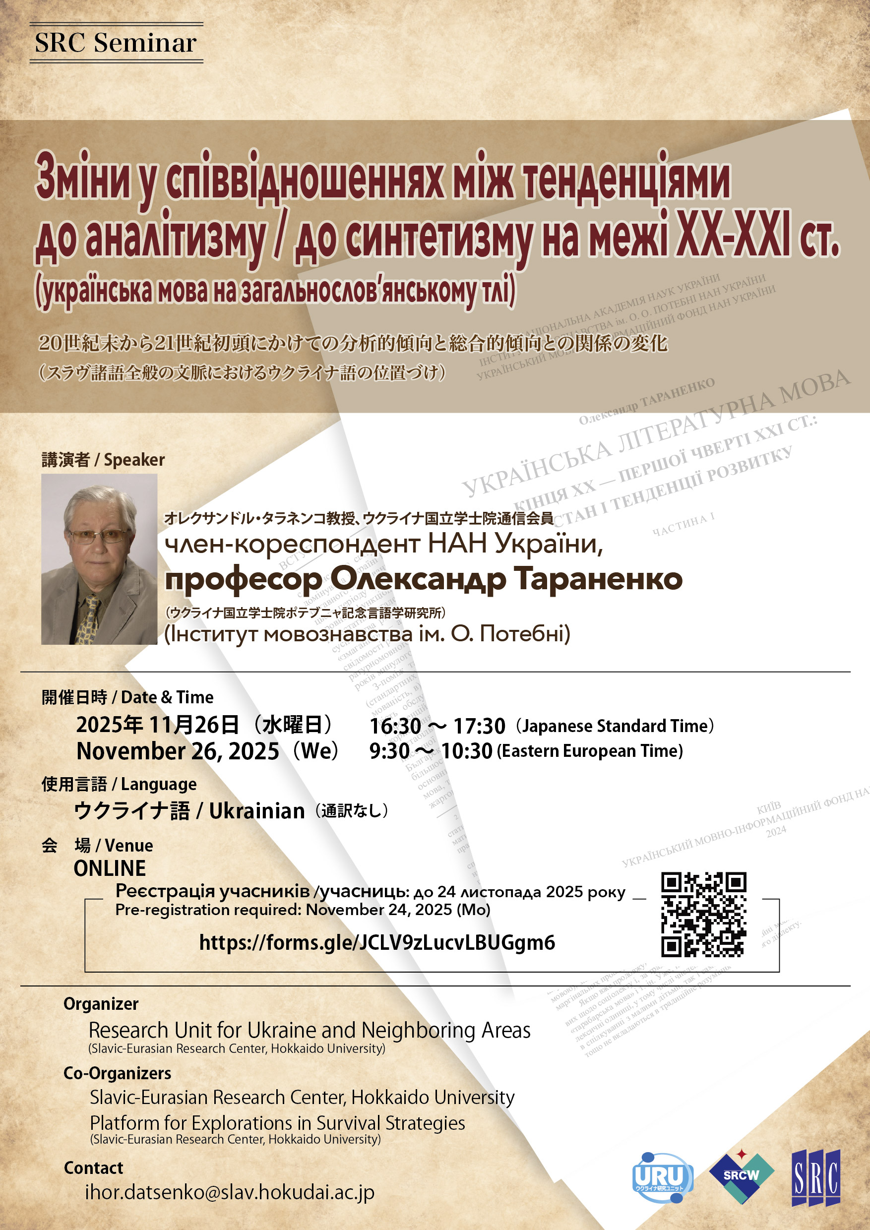 ![]() | “Зміни у співвідношеннях між тенденціями до аналітизму / до синтетизму на межі ХХ–ХХІ ст. (українська мова на загальнослов’янському тлі)” Date and Time: Tuesday, November 26, 2025, 16:30-17:30(JST) / 9:30–10:30 (EET) Speaker: член-кореспондент НАН України, професор Олександр Тараненко (Інститут мовознавства ім. О. Потебні) Registration for Online Participation : https://forms.gle/JCLV9zLucvLBUGgm6 *Deadline: November 24 (Mon), 2025 Language : Ukrainian Organized by : Research Unit for Ukraine and Neighboring Areas (SRC) Co-Organized by : Slavic-Eurasian Research Center, Hokkaido University Platform for Explorations in Survival Strategies at the SRC, Hokkaido University Contact : Norihiro Naganawa < luch[at]slav.hokudai.ac.jp > ([at] read as @) |