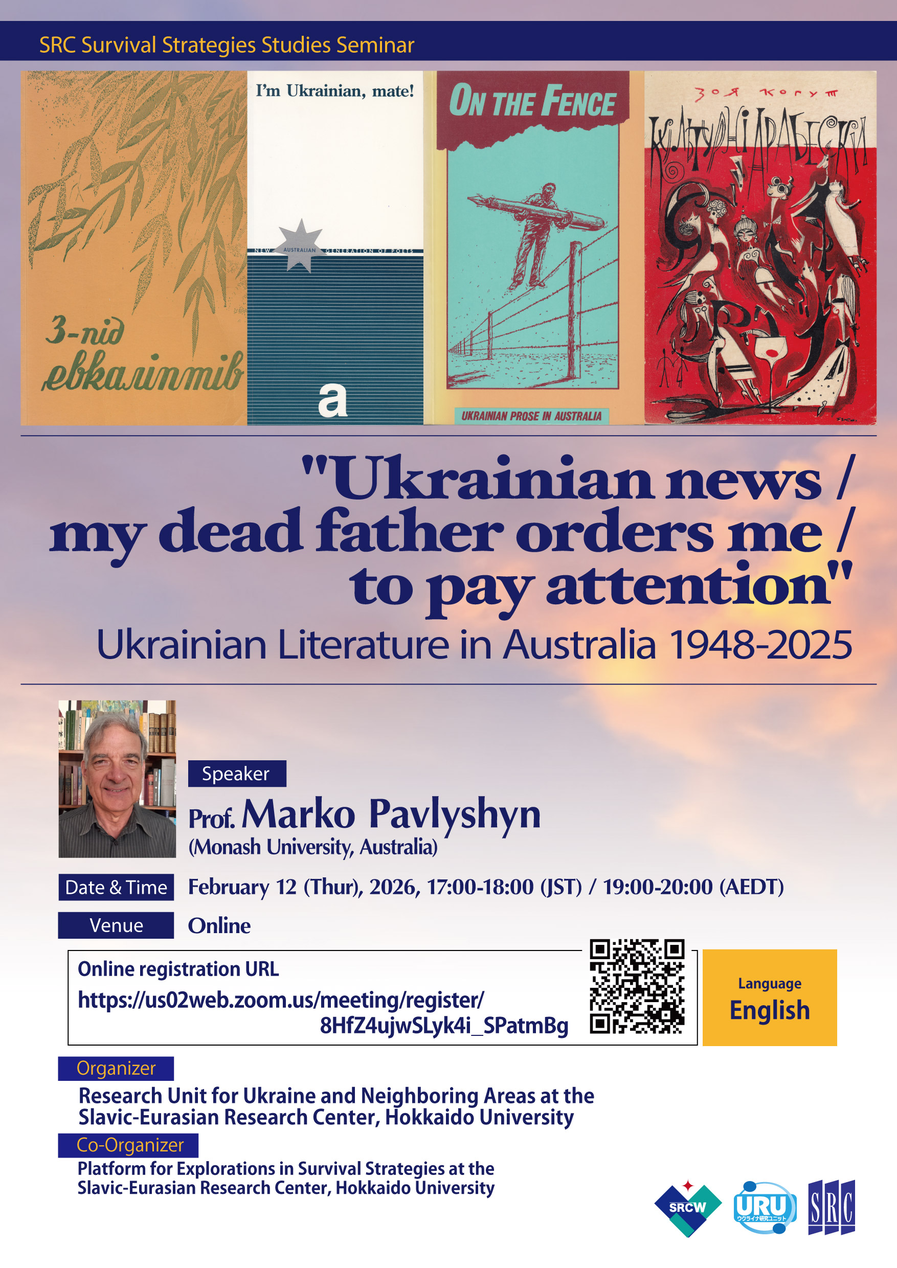 ![]() | “’Ukrainian news / my dead father orders me / to pay attention’ Ukrainian Literature in Australia 1948-2025” 日 時: February 12 (Thur), 2026, 17:00-18:00 (JST) / 19:00-20:00 (AEDT) 講演者: Prof. Marko Pavlyshyn (Monash University, Australia) 使用言語:英語(通訳なし) 形 式: オンラインのみ 参加登録:登録は こちら 主 催:北海道大学スラブ・ユーラシア研究センター「ウクライナ及び隣接地域研究ユニット(URU)」 共 催:北海道大学スラブ・ユーラシア研究センター「国際的な生存戦略研究プラットフォームの構築」 |