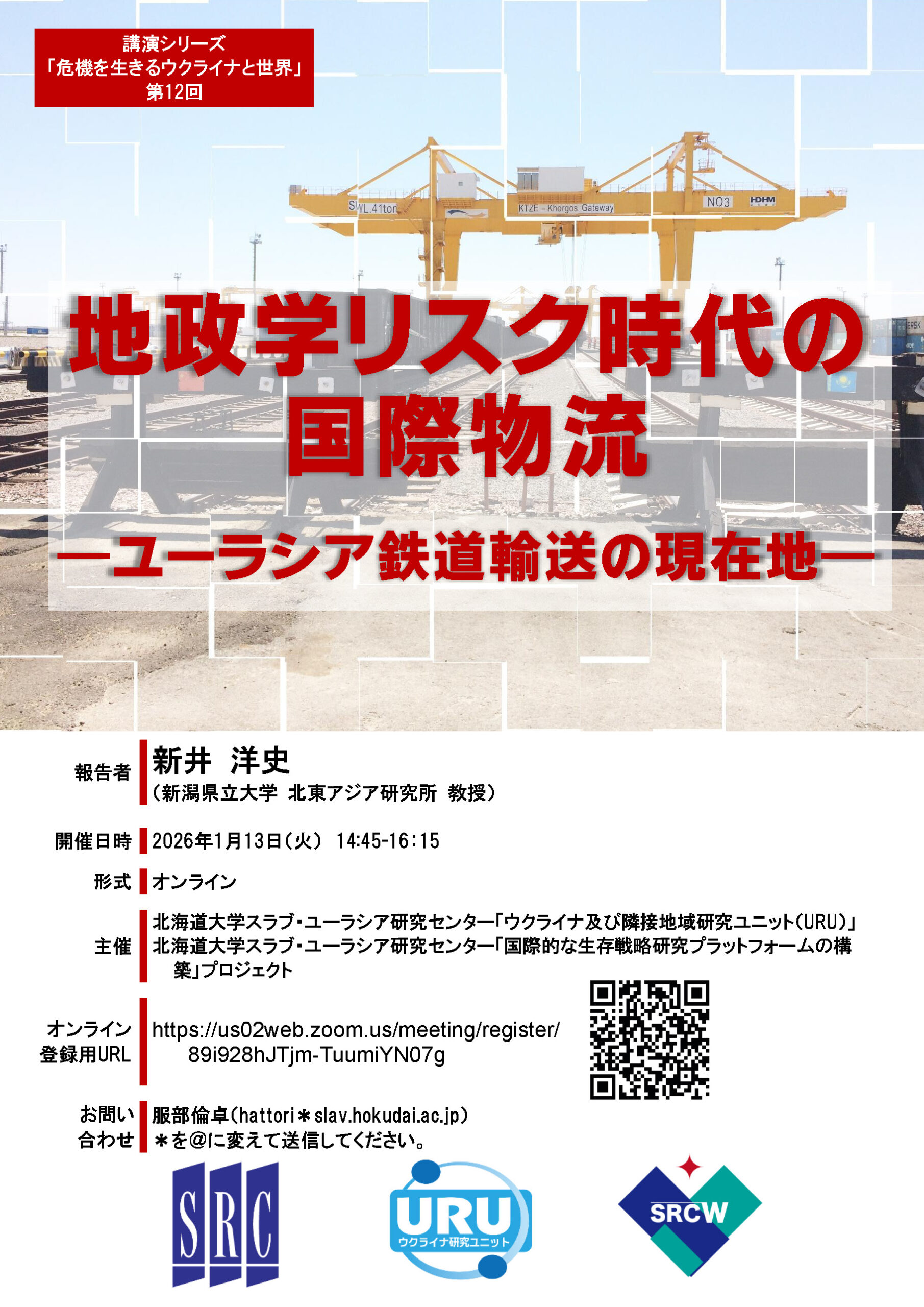 ![]() | 「地政学リスク時代の国際物流 ―ユーラシア鉄道輸送の現在地―」 日 時: 2026年1月13日(火) 14:45-16:15 講演者: 新井 洋史(新潟県立大学 北東アジア研究所 教授) 形 式: オンライン開催 参加登録:登録は こちら 主 催:北海道大学スラブ・ユーラシア研究センター「ウクライナ及び隣接地域研究ユニット(URU)」 北海道大学スラブ・ユーラシア研究センター「国際的な生存戦略研究プラットフォームの構築」 問い合わせ先:服部倫卓(hattori*slav.hokudai.ac.jp )*を@に変えて送信してください。 |